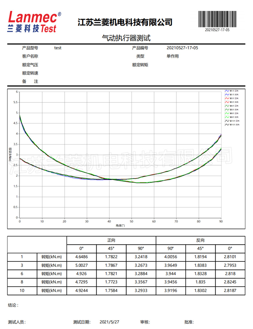蘭菱科技為蘇州紐威閥門有限公司定制的30000N.m撥叉式氣動執(zhí)行器測試臺,調(diào)試完成,得到客戶的肯定! 設(shè)備功能:1、各角度最大扭矩測試,自動調(diào)節(jié)氣壓(0~1MPa)、充放氣,自動控制油缸行程、控制角度,自動測量并記錄角度、氣壓、最大扭矩,并形成曲線和報(bào)表;2、壽命測試,客戶可以自定義加載扭矩、運(yùn)行次數(shù),數(shù)據(jù)異常自動停機(jī),并顯示故障內(nèi)容,考驗(yàn)撥叉式氣動執(zhí)行器的質(zhì)量及使用壽命。